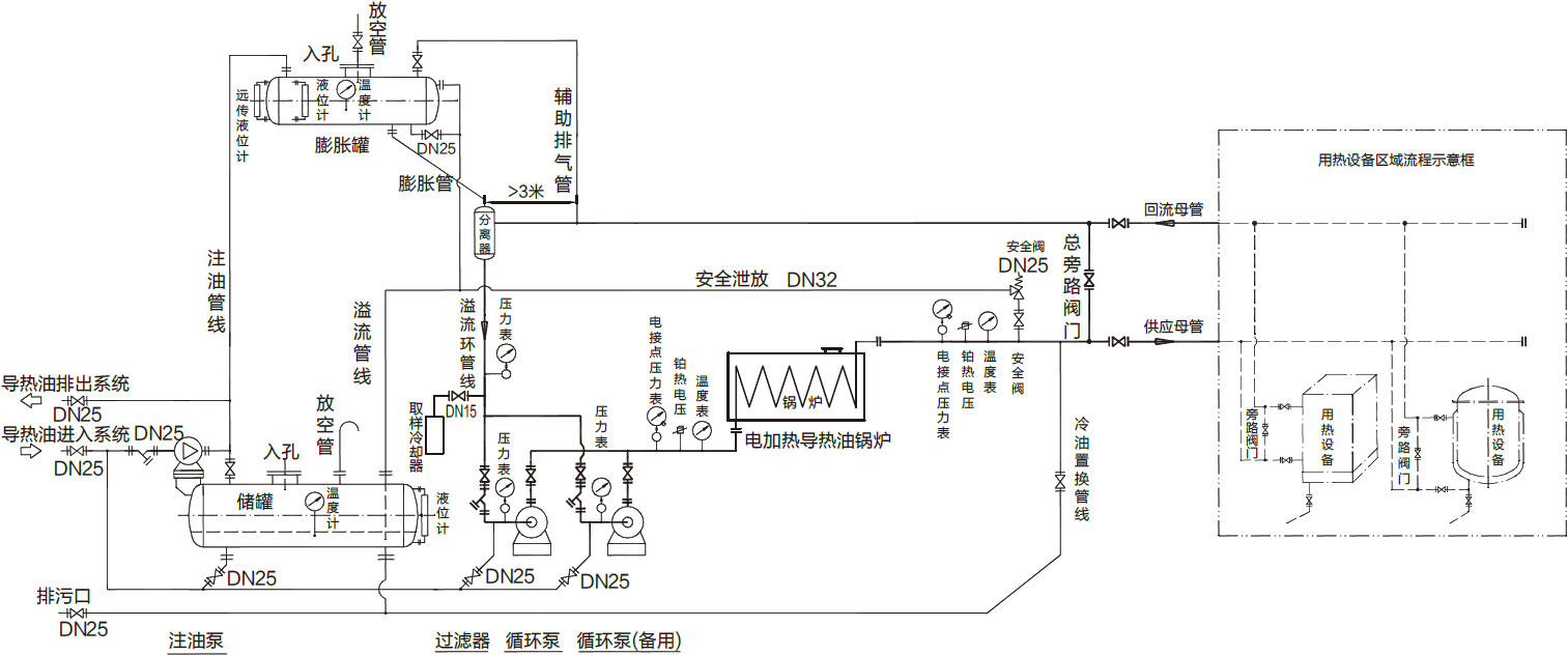 電加熱導熱油(yóu)爐由加熱(rè)機組(加熱管、高溫油泵(bèng)、過(guò)濾器)、膨脹(zhàng)槽、電氣(qì)控製櫃作為一整(zhěng)套設備與(yǔ)客戶的用熱設備進行連接,用戶(hù)隻需接入電源、介質的進出口管道及一些(xiē)電氣接口即可使用。